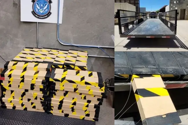 Durante inspecciones de rutina, los oficiales buscaron en un remolque y entre los tubos o marco de la estructura del piso, sacaron varias cajas de cartón con el narcótico.